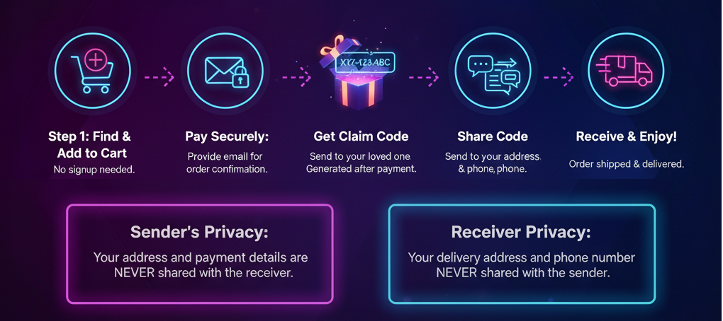 1. Find a product and add to cart. This is the familiar e-commerce starting point. No account is needed, which lowers the barrier to entry and keeps the sender anonymous from the very first step.